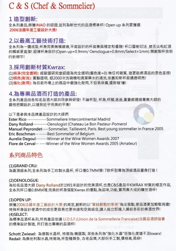全系列都以創新材質KWAEX所打造結合完美的切口(1.2mm),適度的收口,無接縫的杯腳,平整低重心的杯座,成為完美酒杯的標準!