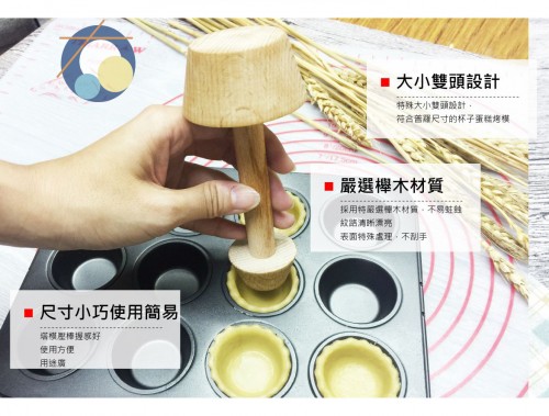 2. 嚴選櫸木製塔模壓棒,雙頭大小設計,小的一頭(直徑約3 cm) 適合製作 迷你水果塔烤盤模使用;大的一頭 (直徑約5 cm) 適合一般大小的杯子蛋糕烤模使用,讓您輕鬆將麵糰壓成完美杯型。