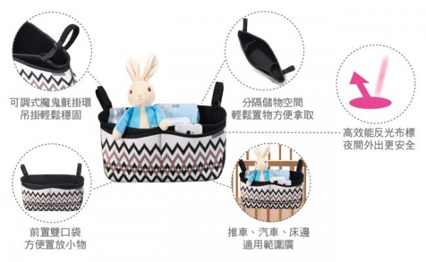 1. 黏扣帶式掛環可調整需要的長度,方便懸掛和拆卸,使用範圍廣,推車、汽車、床邊、居家均適用。