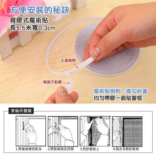 2.防蚊紗窗容易使用,方便拆洗,需要清洗時,只需將防蚊紗窗從魔術貼(粘扣帶)上直接拿下,重新安裝只需將防蚊紗窗按在魔術貼上即完成。