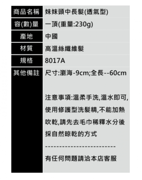 妹妹頭中長肩下長髮假髮-7色任選(透氣型)