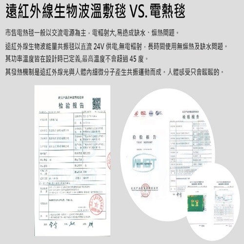 生物能量共振墊 以 直流 24V 供電,無電輻射,長時間使用無燥熱及缺水問題。其功率溫度皆在設計時已定義,最高溫度不會超過 45 度。其發熱機制是遠紅外線光與人體內細微分子產生共振運動而成。人體感受只會 暖暖的。